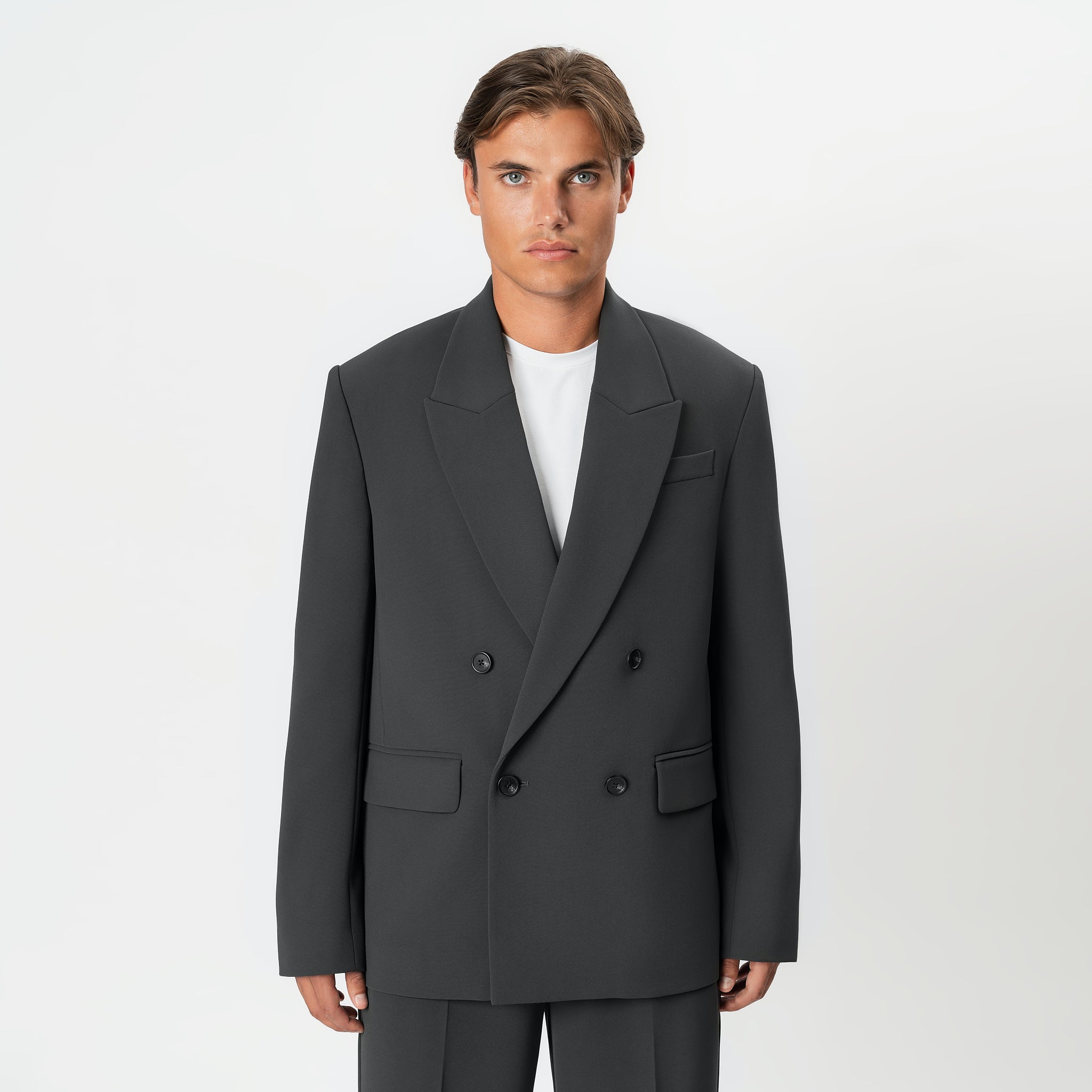 A relaxed, contemporary take on suiting with dropped shoulders and clean structure. Soft drape, full lining, and refined detailing for effortless, elevated wear.